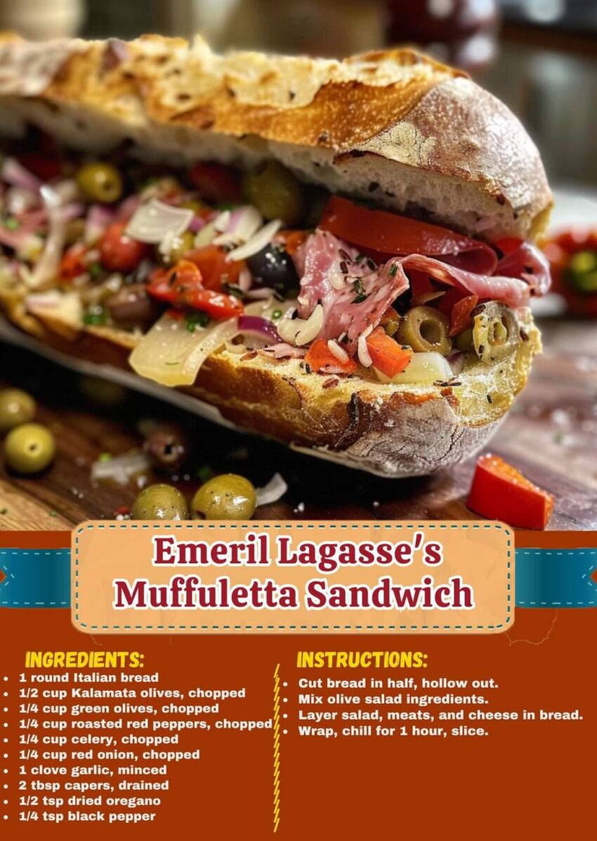 Here’s a delicious version of Emeril Lagasse’s Muffuletta sandwich, famous for its flavorful layers of meats, cheese, and a tangy olive salad!