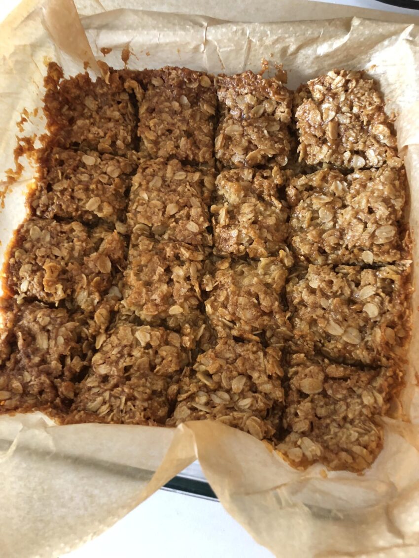 - Ta ut plåten och låt havrerutorna svalna helt innan du skär dem i rutor. Toppingens konsistens kommer att bli härligt knäckig när den svalnar.