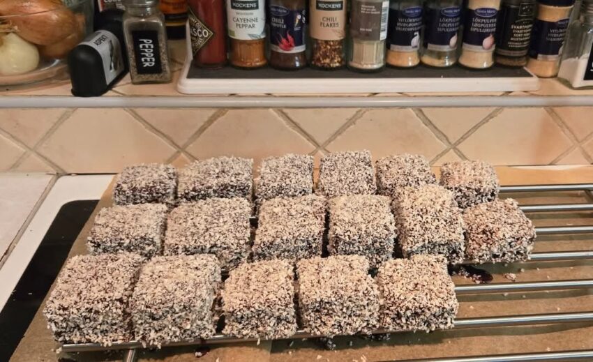 - Place the finished Lamingtons on a tray or plate and allow them to set for about 30 minutes.