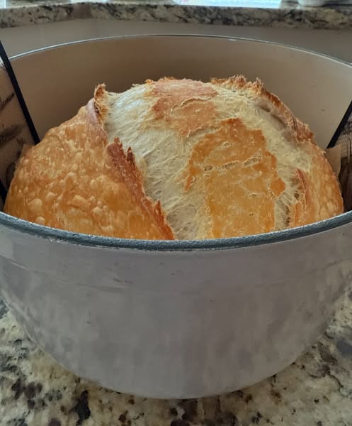 Bake for 25-35 minutes, until the bread has a golden-brown crust. You can check for doneness by tapping the bottom of the bread. If it sounds hollow, it’s ready.